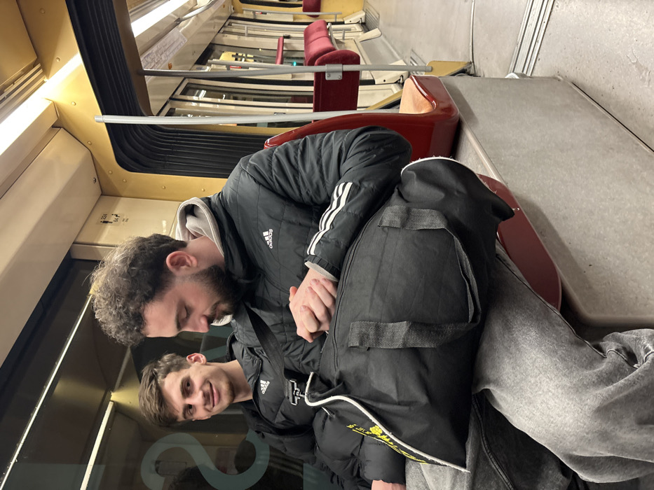 Inside a train, a man with curly hair and a beard sleeps, resting his head on his intertwined hands. Another man, reflected in the train's window, smiles. The sleeping man wears a black Adidas jacket with white stripes. A black bag lies next to him on the red seat. The train car is beige, with maroon seats visible further down the aisle. The train's interior is visible through the windows.