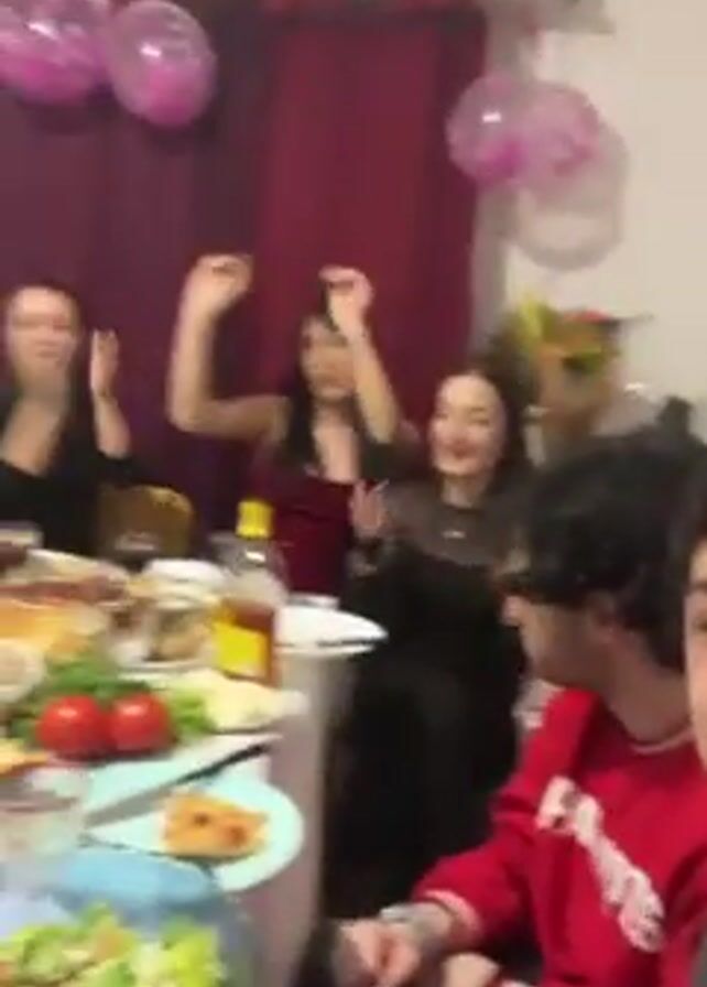 A video shows a group of young adults having a party, likely a birthday celebration, gathered around a table laden with food and drinks