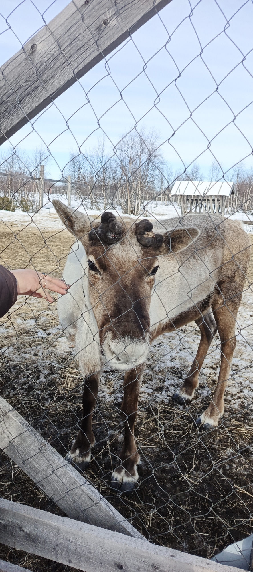 A reindeer stands behind a wire fence, with a person's hand reaching through to touch it. The reindeer has a dark brown face and legs, with light brown and white fur on its body. Its antlers are small and covered in velvet. The person's hand is pale and adorned with rings. The ground is covered in mud, straw, and patches of snow. In the background, there are bare trees and a wooden structure. This image was taken in Naryan-Mar, Russia.