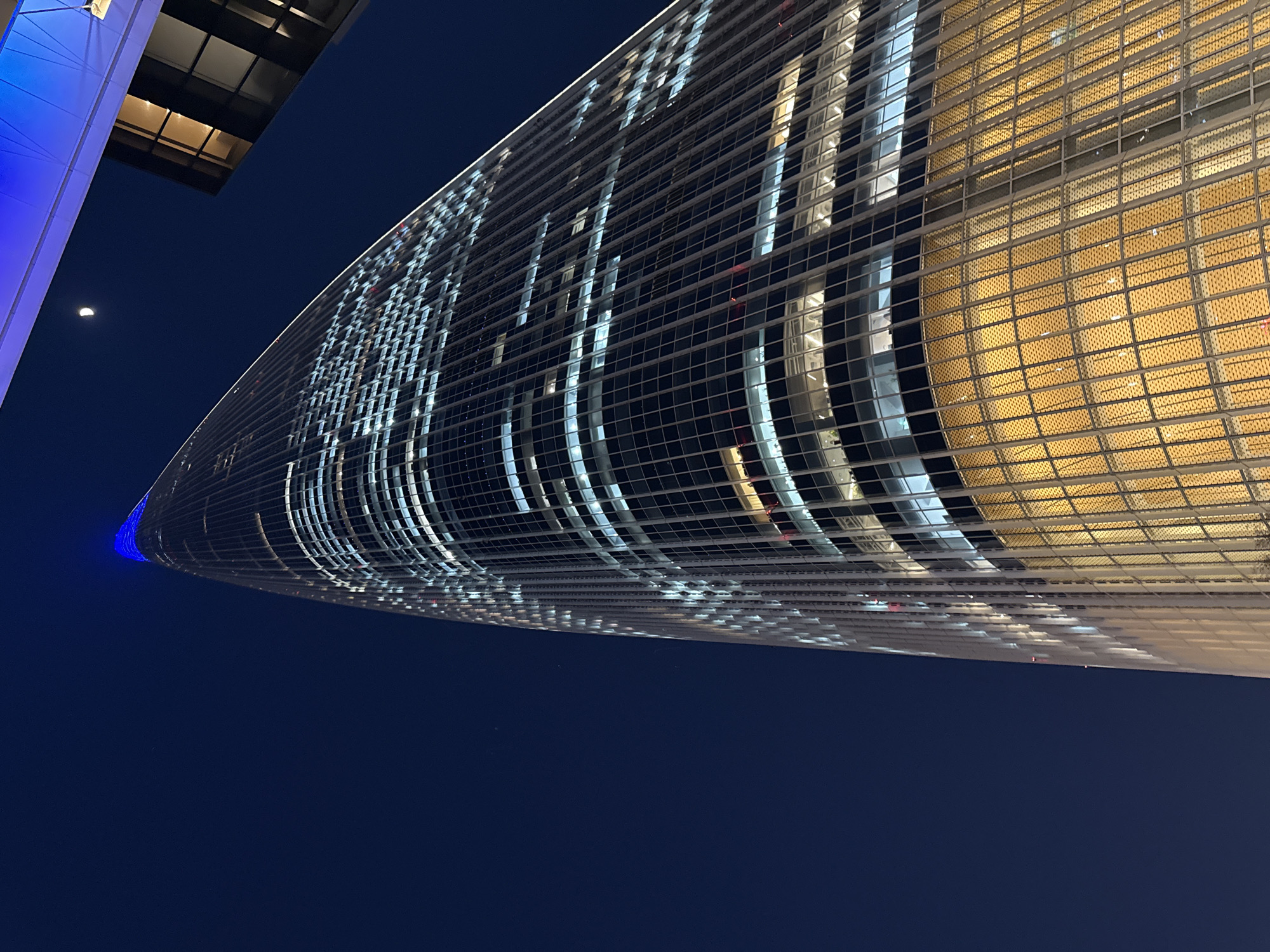 The image displays the Lotte World Tower in Seoul, South Korea, at night, viewed from a low-angle perspective looking upwards. The skyscraper's exterior, composed of glass and steel, is extensively illuminated. Numerous interior lights, primarily white and cool blue, create varied luminous patterns across the building's immense height. The tapered spire at the apex of the structure glows with a distinct blue light. A section of the building's lower facade exhibits a warm, golden-yellow illumination visible through a detailed grid-like pattern. The dark blue night sky occupies the upper left and central portions of the frame, featuring a clear crescent moon positioned in the upper right quadrant. A segment of an adjacent, angular building, illuminated internally with warm light and externally with a blue light source from below, is partially visible along the right edge of the frame. No individuals, specific actions, or interactions are discernible within the scene.