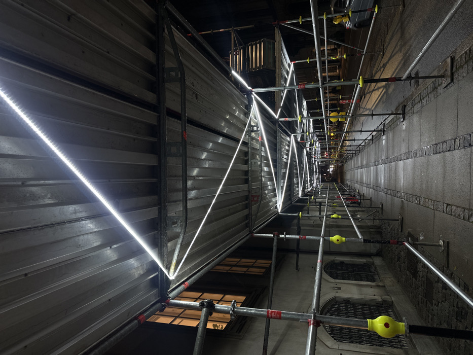 The image displays a nighttime scene within a long construction scaffolding tunnel situated over a wet pedestrian sidewalk and adjacent to a street in Copenhagen, Denmark, specifically next to Christiansborg Palace