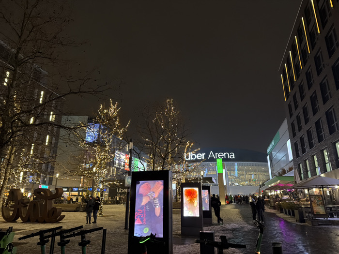 Illuminated displays line a pedestrian walkway in front of Uber Arena. Trees wrapped in string lights frame the scene, casting a warm glow on the snow-dusted ground. A large, abstract sculpture sits to the left. People stroll along the path towards the arena, while others gather at outdoor patios on the right. The architecture includes both modern buildings with bright vertical stripes and more traditional structures. The sky is a dark, overcast gray.