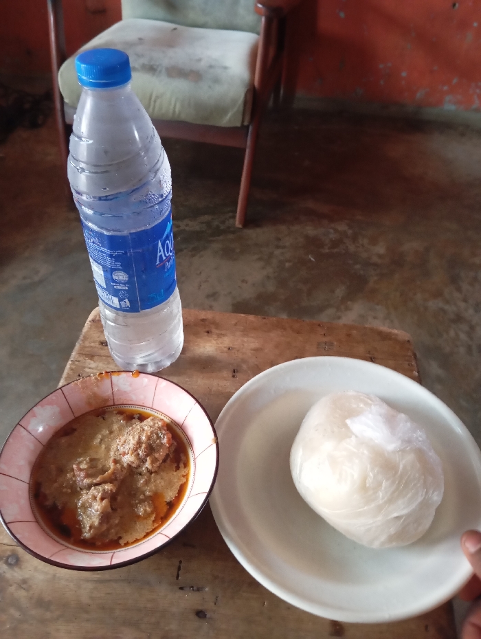 The scene, set in Okere-Urhobo, Nigeria, features a meal resting on a light-brown wooden surface. A clear plastic bottle of Aqua Rapha Purified Water with a blue cap shows condensation. Adjacent to it, a pink-patterned ceramic bowl contains a light-brown stew with protein chunks and a reddish oil layer. A white circular plate holds a white, rounded mass of "swallow" food, encased in clear plastic film. A dark-skinned human hand is partially visible at the bottom right, holding the edge of the white plate. In the background, a worn armchair with light-colored upholstery and wooden arms stands against a reddish-orange wall exhibiting wear and discoloration. The floor appears to be a discolored, uneven surface.