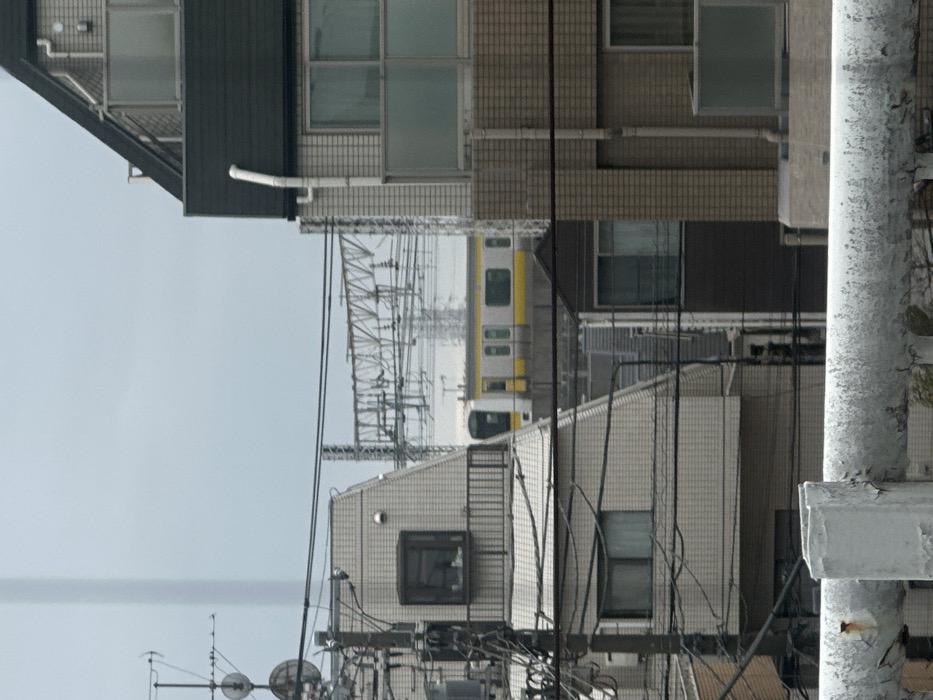 Buildings with windows and varying heights fill the frame, along with utility poles and wires. A glimpse of a train, mostly yellow with some white, is visible between the buildings. A white, cylindrical structure occupies the right foreground. The sky is overcast and pale, adding to the muted color palette.