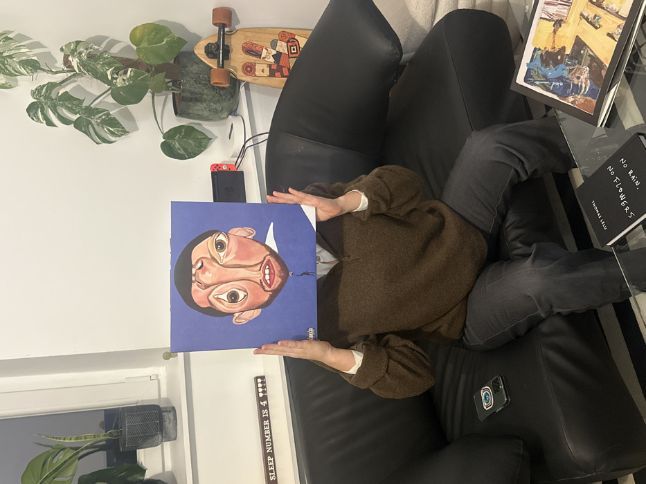 A person reclines on a black couch, holding a vinyl record depicting a cartoonish face, obscuring their own. They wear a brown sweater and gray pants. A skateboard and a potted monstera plant are on the wall behind the couch. A Nintendo Switch rests next to the plant. Two books, including one titled "No Rain, No Flowers," and a phone lie nearby on the couch. A decorative sign reading "SLEEP NUMBER IS 4" is visible near the window.