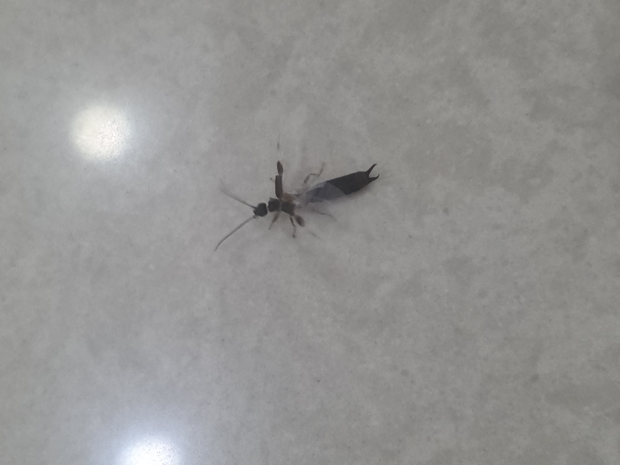 A single, dark-bodied insect, approximately 1.5-2 cm in length, rests stationary on a textured, light gray surface. The insect, consistent with an earwig (Dermaptera), exhibits a dark head with visible antennae, a lighter brown thorax, and a dark, elongated abdomen terminating in prominent pincer-like cerci. Two translucent wings are partially visible, folded over the abdomen. Six dark legs are splayed from the thorax. The light gray surface, possibly concrete or a matte tile, features subtle variations in tone and texture. Specular highlights from ambient lighting are visible in the lower-left and upper-right portions of the frame. No other subjects or objects are depicted. The scene is located in Pantegajah, Indonesia.