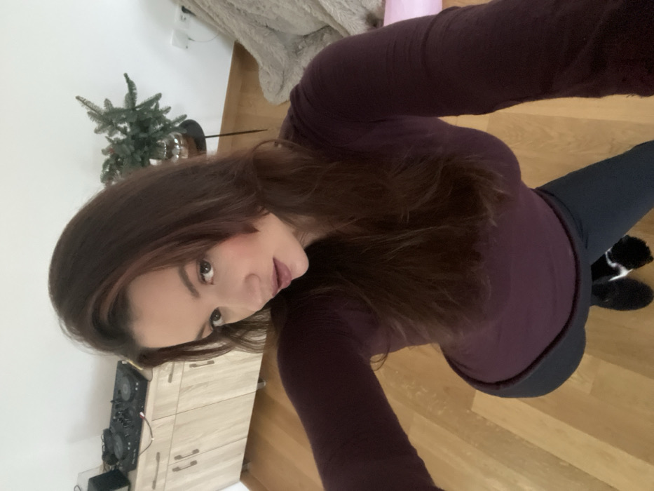 An indoor photograph taken from a high angle depicts a single female subject in a residence located in Budva, Montenegro. The subject, with medium-length dark brown hair, fair skin, and an attentive expression with slightly parted lips, is wearing a long-sleeved maroon top, dark blue athletic-style pants, and black fuzzy slippers with white accents. She appears to be taking a selfie, holding the camera in an extended arm and looking downwards towards it. The background features a light-colored wooden floor and plain white walls. To the left of the subject, a light-toned wooden cabinet with multiple doors and drawers is visible, upon which two black DJ turntables or controllers and a mixer are set up, connected by cables. To the right, a small black round table supports a metallic bowl containing a green plant, resembling a small pine or fir. A light beige or cream-colored textured blanket is draped over an unseen object in the far right background, with a portion of a pink mat visible on the floor beneath it.