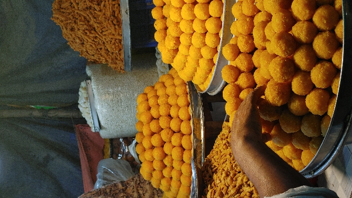 The image displays a densely packed market stall in Narayanganj, Bangladesh. In the foreground, a dark-skinned human hand, partially visible with a white sleeve cuff, is positioned above a large, round, silver-colored metal tray overflowing with numerous spherical, bright yellow-orange sweets. To the left and slightly behind, two additional similar trays present identical conical mounds of these yellow-orange sweets. Further left, a quantity of lighter yellow-brown, elongated fried snacks is visible in a separate container. In the background, on the right, a large tray holds a substantial mound of dark orange, textured, stick-like fried snacks. Centrally in the background, a large, light-colored sack filled with granular items supports a smaller, rectangular metal tray containing white, elongated sweets or snacks. The entire scene is set against a dark, textured fabric backdrop, with a vertical support pole and a green strip visible on the left. The environment suggests an active commercial setting with various food items on display.