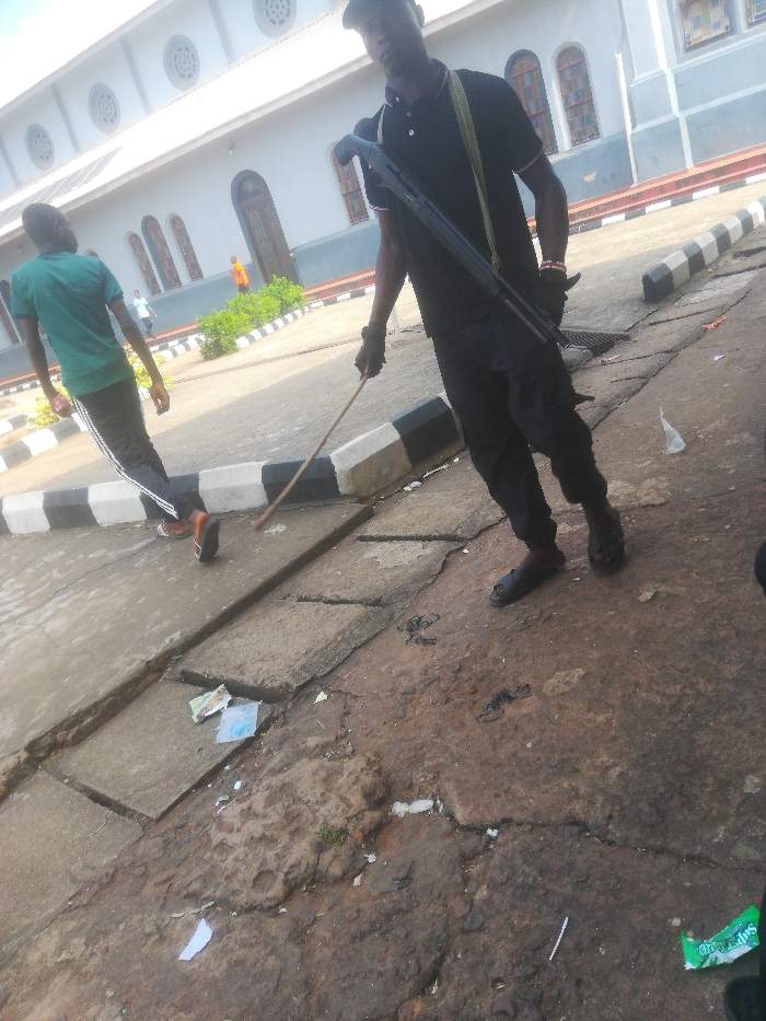 The image depicts an outdoor street scene in Alor, Nigeria, under daylight conditions. The foreground features a cracked concrete and dirt path littered with small pieces of paper and plastic wrappers, including a green wrapper on the far right. A male individual is prominently featured in the mid-ground, walking towards the viewer's left. He wears a dark cap, dark polo shirt, dark trousers, and dark open-toed sandals. A dark-colored long gun, consistent with a shotgun, is slung across his back with a light-colored strap. He holds a light-colored stick in his right hand, which is positioned towards the ground. A multi-colored beaded wristband is visible on his left wrist. To the left of the primary subject, a second male individual is walking away from the camera, moving from left to right. He wears a green short-sleeved shirt, dark trousers with white vertical stripes on the outer seams, and light-colored athletic shoes with orange accents. In the background, a large, multi-story building is visible. Its upper section is white with circular decorative motifs, while the lower section is light blue. The building features several arched windows, some appearing to have stained glass, and a large arched wooden door. A concrete curb, painted with alternating black and white stripes, separates the immediate foreground area from a paved surface leading to the building. Green shrubs are positioned in front of the building. Further in the background near the building, additional indistinct figures are present, one appearing to wear an orange shirt.