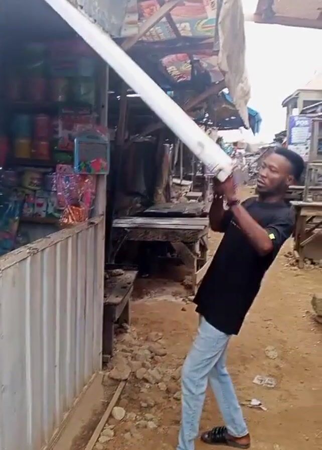 A young man in a black t-shirt and light blue jeans opens the metal shutter window of a small roadside shop in an outdoor market. He first struggles to pull the shutter up, then uses his body to push it up further, revealing the goods inside the shop. The shop contains colorful plastic goods and toys. The surrounding market environment is visible with other makeshift stalls and walking people. The ground is dirt.