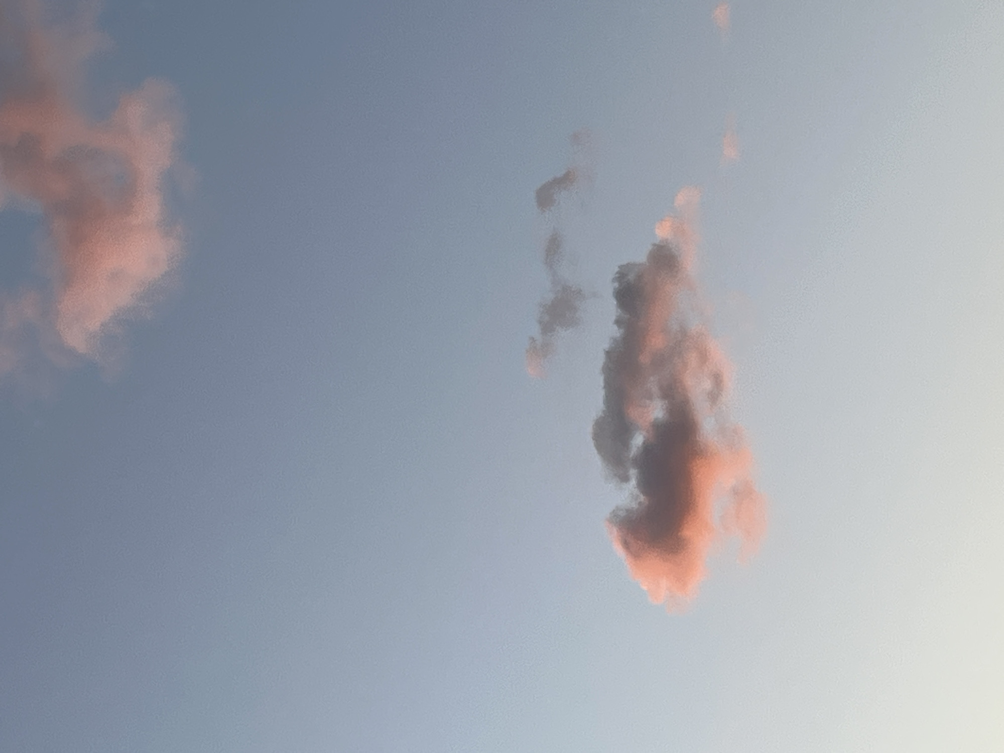 two groups of clouds in a blue sky. The clouds are tinted pink/red. The clouds appear to be high cirrus or altocumulus clouds. There are no people, subjects, or objects other than the sky and the clouds. There are no interactions taking place. The location is not discernible based on the provided image. The city of Fez, Morocco, cannot be identified from the image.