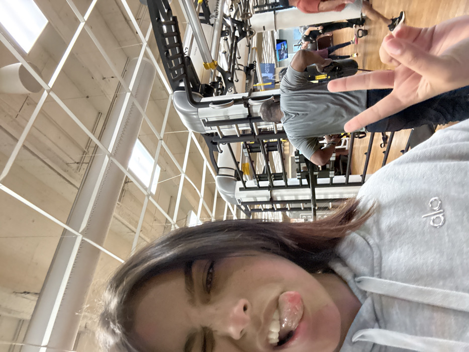 The image depicts the interior of a fitness center, specifically identified as Life Time Athletic - Plainsboro in Plainsboro Township, New Jersey, United States. In the immediate foreground, the upper torso and head of a young female are visible, positioned for a selfie. She has dark hair, wears a grey hooded sweatshirt with an "alo" logo, squints her eyes, and extends her tongue from her mouth. Her left hand is raised, displaying a two-finger peace sign. The background reveals the gym floor, populated by multiple individuals and exercise equipment. A muscular male, seen from behind, wears a grey t-shirt and dark pants, holding black straps attached to a large grey and black multi-station fitness rig with yellow accents. A white sign on the equipment includes the text "OUTRACK." Other gym patrons are present, including one near a red kettlebell and another partially visible in an orange shirt. A blue display screen is discernible in the distance. The flooring is a light wood finish. The ceiling is a grid-style drop ceiling with recessed rectangular fluorescent lights, suspended circular pendant lights, and visible grey and white cylindrical air ducts.