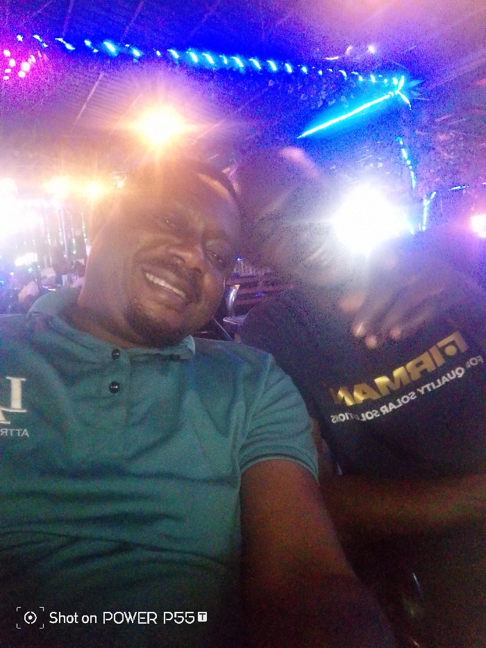 A brightly lit selfie captures two individuals. The person in the foreground is wearing a teal polo shirt with a logo. A second person, partially visible, is wearing a dark t-shirt with a logo in gold lettering that reads "CIRAMAN FOR QUALITY SOLAR SOLUTIONS." The photo appears to have been taken in a crowded venue, as indicated by the lighting and the presence of other people in the background. The camera model is "POWER P55T".