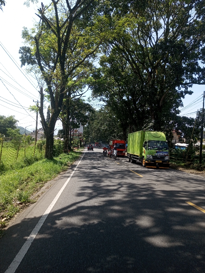 The image displays a two-lane asphalt road under daylight conditions in the city of Beteng_Pangkhar_Somthrang, Bhutan. The road features a solid white line marking the left edge and a solid yellow line near the center. Dense, mature trees with green foliage line both sides of the road, casting prominent shadows across the pavement. On the left side, a grassy verge and a wire fence separate the road from further vegetation and distant structures, including a white building with a red roof and an unreadable sign. Utility poles with multiple wires are visible on both sides of the thoroughfare. On the right side of the road, a bright green box truck, identified by its green cab and container, is parked on the shoulder, facing away from the viewer. Behind it, a red truck is partially visible, followed by a cluster of approximately five to seven motorcycles in the right lane. A dark-colored sedan is present in the left lane, moving away from the camera. Additional vehicles are visible further down the road, indicating active traffic. A blue tarp or similar object is partially visible behind the green truck on the right.
