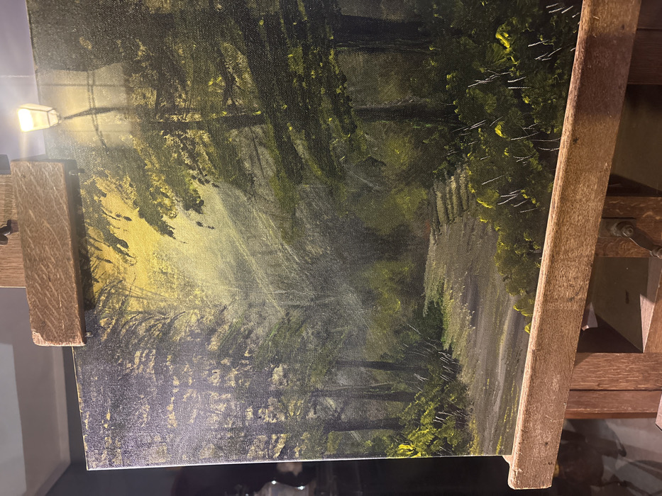 An oil painting depicting a forest scene is displayed on an easel. The canvas is filled with dark greens and yellows, creating a sense of depth and light. The painting shows a path winding through the trees, with sunlight filtering through the canopy. The composition suggests a peaceful, natural setting. The easel, made of wood, supports the artwork and adds a touch of authenticity to the scene.