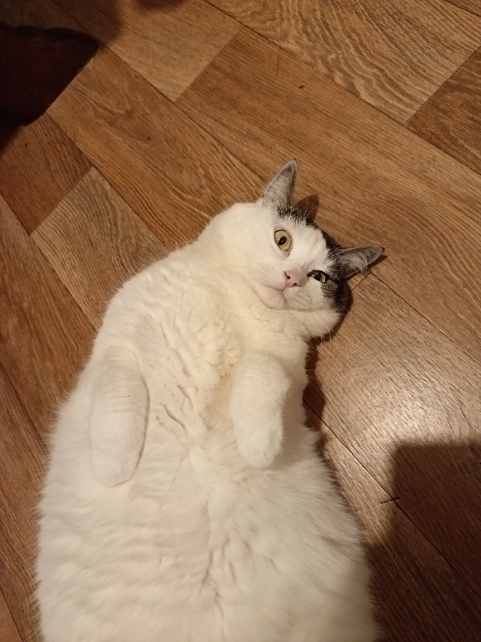 - "A chubby, mostly white cat lies on its back on a wooden floor" by FM-QWmIy2, licensed under CC BY 4.0