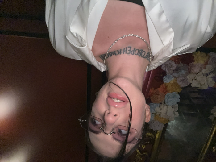 A female individual is depicted in a chest-up portrait indoors in Tibubeneng, Indonesia. She is looking upwards and to the right, away from the camera. Her dark hair is pulled back, with a few strands framing her face. She wears light pink tinted, rimless octagonal eyeglasses with silver frames. Her lips are glossy and slightly parted, revealing her tongue. A Cyrillic tattoo, reading "УГОВОРЁН К" (Ugovoron K), is visible on her neck, situated above a silver-colored rope chain necklace. She is dressed in an open, oversized white collared shirt, revealing a dark garment underneath. To the left of the subject, a portion of an ornate gold-framed mirror is visible, partially obscured by a decorative cluster of artificial flowers in various pastel hues, including blue, white, peach, yellow, and orange. The background to the right is a dark reddish-brown surface, likely a wall, with subtle internal light reflections. The environment is dimly lit.