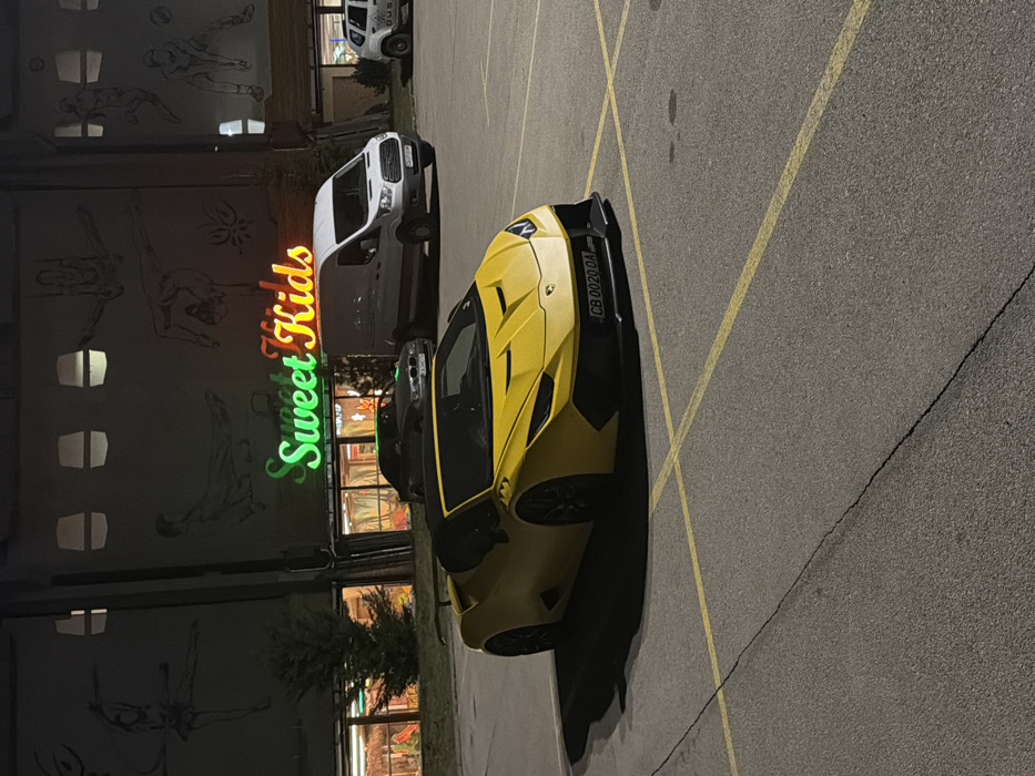 The image depicts an outdoor parking lot at night, located at Boulevard "Bulgaria" 81A, Sofia, Bulgaria. A multi-story commercial building forms the background, featuring faded murals of athletic figures on its dark upper facade. Below these murals, an illuminated neon sign displays "Sweet Kids" in green and orange lettering. Large windows at ground level reveal an illuminated interior. In the foreground, a bright yellow Lamborghini Huracán convertible with a black soft top and rear wing is parked diagonally across two marked spaces. Its front license plate reads "CB 0020 OA." Behind the Lamborghini, a white Ford Transit van is parked facing right, and a dark BMW convertible is partially visible to the left. A white Dacia Duster SUV is visible in the far background on the right. The asphalt parking surface is marked with faded yellow lines. No individuals are present.