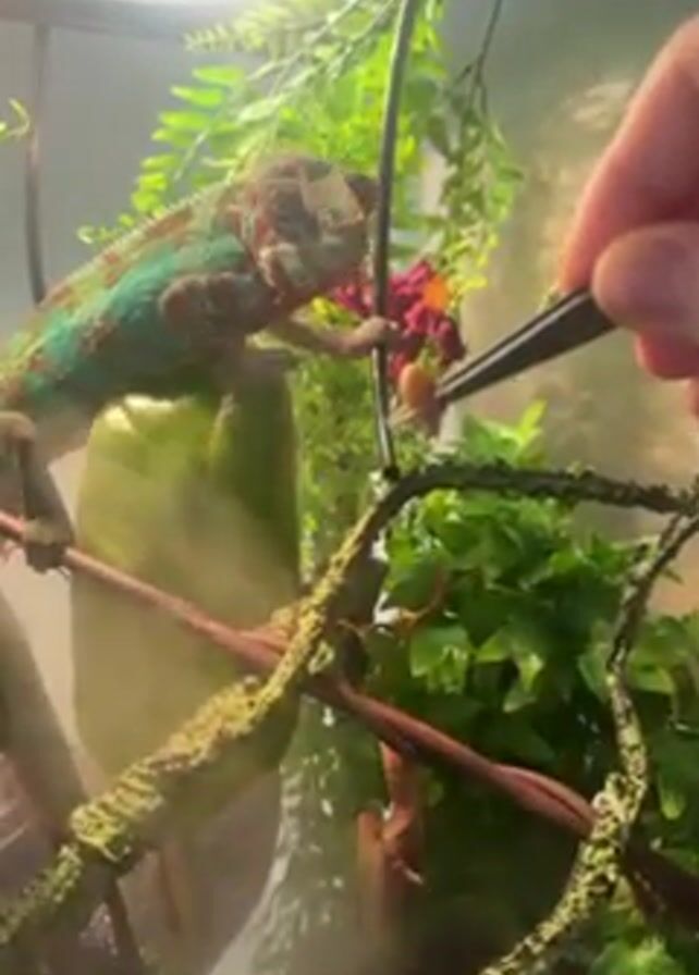 A chameleon is being fed with tweezers inside of its terrarium