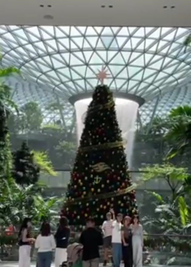 In an interior space with a triangular-patterned glass dome, a large Christmas tree stands decorated with colorful ornaments, topped by a star, and partially obscuring a waterfall feature behind it. A group of people, including men and women of various ages, are gathered around the tree. Some individuals are taking pictures or videos, while others stand nearby observing. A baby stroller is visible on the left side of the frame. The surrounding environment includes greenery and other trees. People are moving around, contributing to the lively atmosphere of the scene.