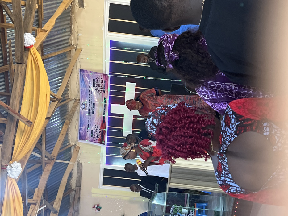 Inside a church, a group of people gathers near the altar. Some are dressed in colorful patterned clothing, while others wear more muted tones. A banner displays "CHURCH OF CHRIST IN NATIONS (COCIN) AMAZING GRACE OF GOD," and "ALHERIN ALLAH MAMAKI," indicating a religious organization. A large white cross is illuminated in the background. Yellow fabric is draped on a wooden structure.