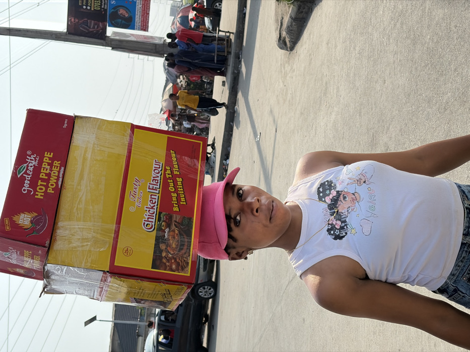 A young adult female is depicted from the waist up, centered in a bright outdoor street scene in Jakande, Nigeria