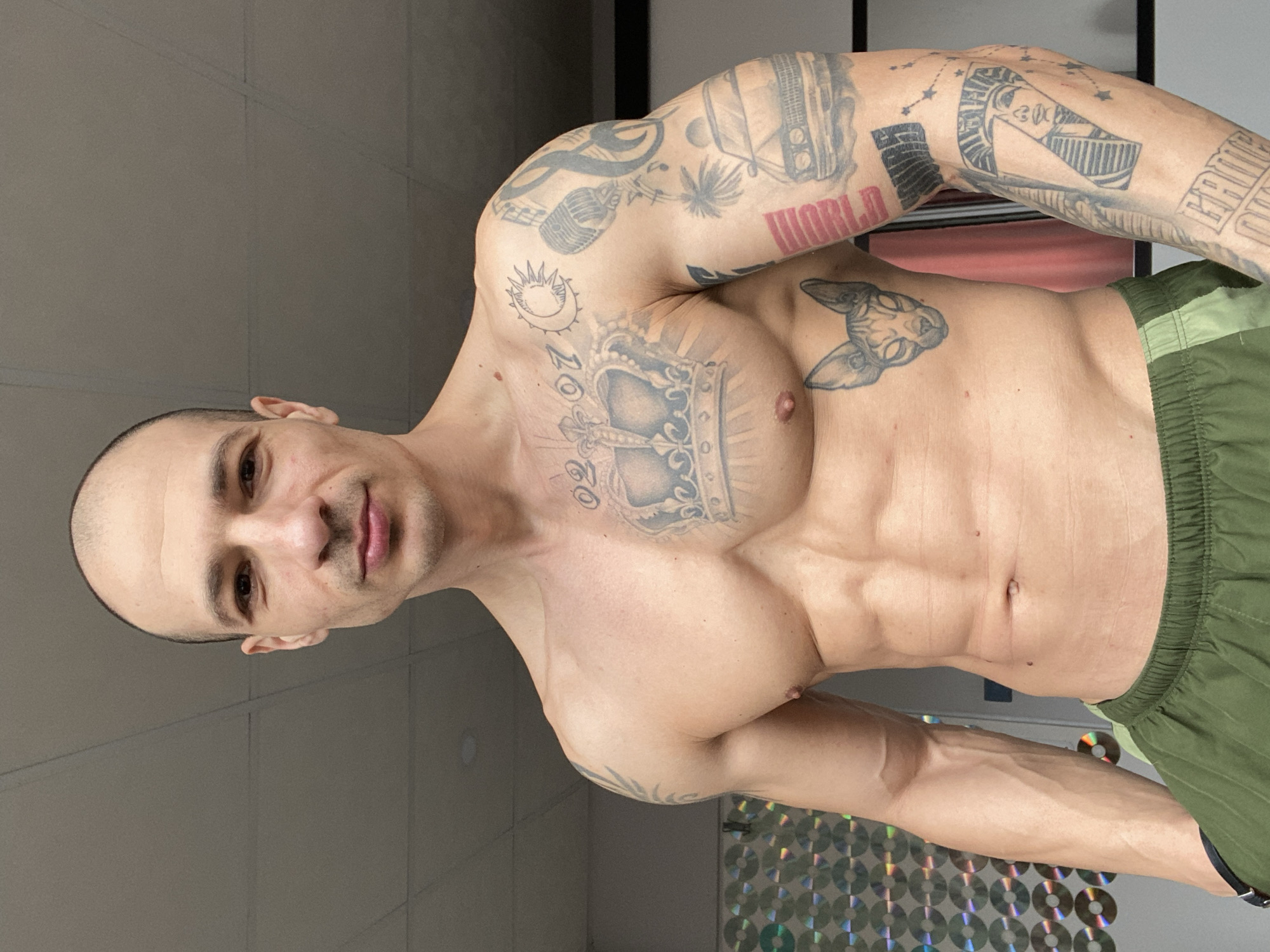 A shirtless man with a shaved head and numerous tattoos on his chest and arms poses indoors