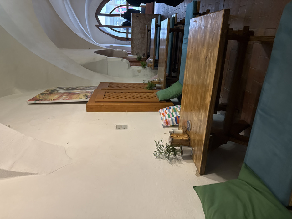 The image depicts the interior of a dining establishment in the city of Znojmo, Czechia. The room features white, textured walls with visible signs of wear and a vaulted ceiling supported by arched structures. The floor is tiled with reddish-brown square pavers. In the foreground and extending into the midground, multiple rustic wooden tables with trestle bases are arranged. Each table is accompanied by long wooden benches fitted with teal blue cushions. Green throw pillows are placed on the benches and against the wall. On the nearest table, a small potted plant in a silver bucket, a wooden block holder, a salt and pepper shaker, and a coaster with "BOHÉM" printed on it are visible. A multi-colored cushion with a geometric pattern rests on a bench slightly further back. Against the right wall, a tall wooden cabinet with two doors, each carved with a chevron or zigzag pattern, stands. Above this cabinet, a large, colorful abstract artwork is mounted on the wall. Further into the background, additional tables and benches are arranged. At the far end of the room, a large arched opening, likely an entrance or exit, allows natural light to enter. Several individuals are partially visible near this opening, appearing as silhouettes or dark figures, some wearing coats, suggesting they are either entering, exiting, or standing near the threshold. Their specific actions or interactions are not discernible.