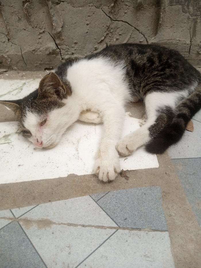 The image depicts a domestic cat resting on its left side on a tiled surface in Mtopanga ward, Kenya