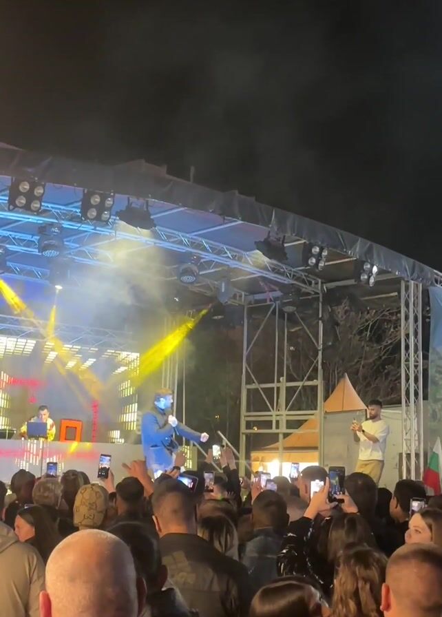 A male performer in a blue suit stands on a stage, performing for a crowd of people at night. The stage is metal scaffolding with a large video screen behind him. On the screen are graphics that resemble sound equalizers, as well as logos. Two other people are also on stage: one at a DJ setup on the left and another standing on the right. The stage is lit with spotlights and colored lights. The crowd is holding up their phones, apparently recording the performance. Some Bulgarian flags are visible within the crowd. The sky is dark.