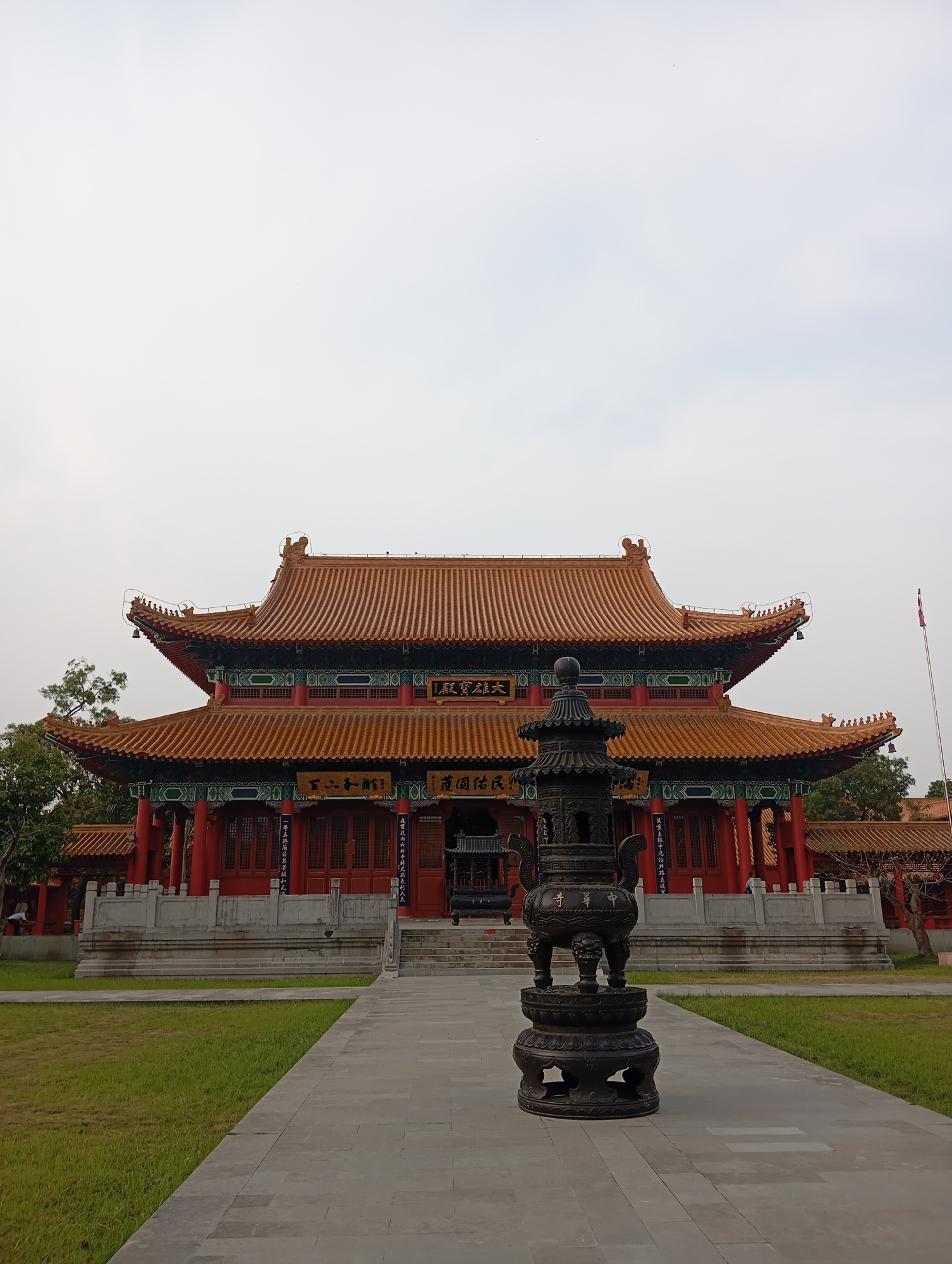 The image depicts the exterior of the Chinese Buddhist Temple in Lumbini Sanskritik, Nepal, under an overcast sky. In the foreground, a large, dark bronze incense burner with intricate carvings, three legs, and two handles stands centrally on a grey paved walkway. Chinese characters are visible on its body. The paved walkway extends directly towards the temple, flanked by well-maintained green grass lawns. The main subject is a prominent, two-tiered Chinese-style temple building, characterized by its vibrant red pillars and walls, accented with green, blue, and gold decorative elements. Its roofs are covered with orange-brown glazed tiles, featuring multiple upturned eaves adorned with small figures and bells. Gold-colored Chinese script is present on horizontal plaques above the main entrances. A grey stone balustrade sits atop a raised platform in front of the temple, with steps leading to the entrance. Trees with green foliage are visible on both the left and right sides of the temple. A tall flagpole with a light-colored flag is positioned on the far right. No discernible individuals or specific actions are clearly visible.