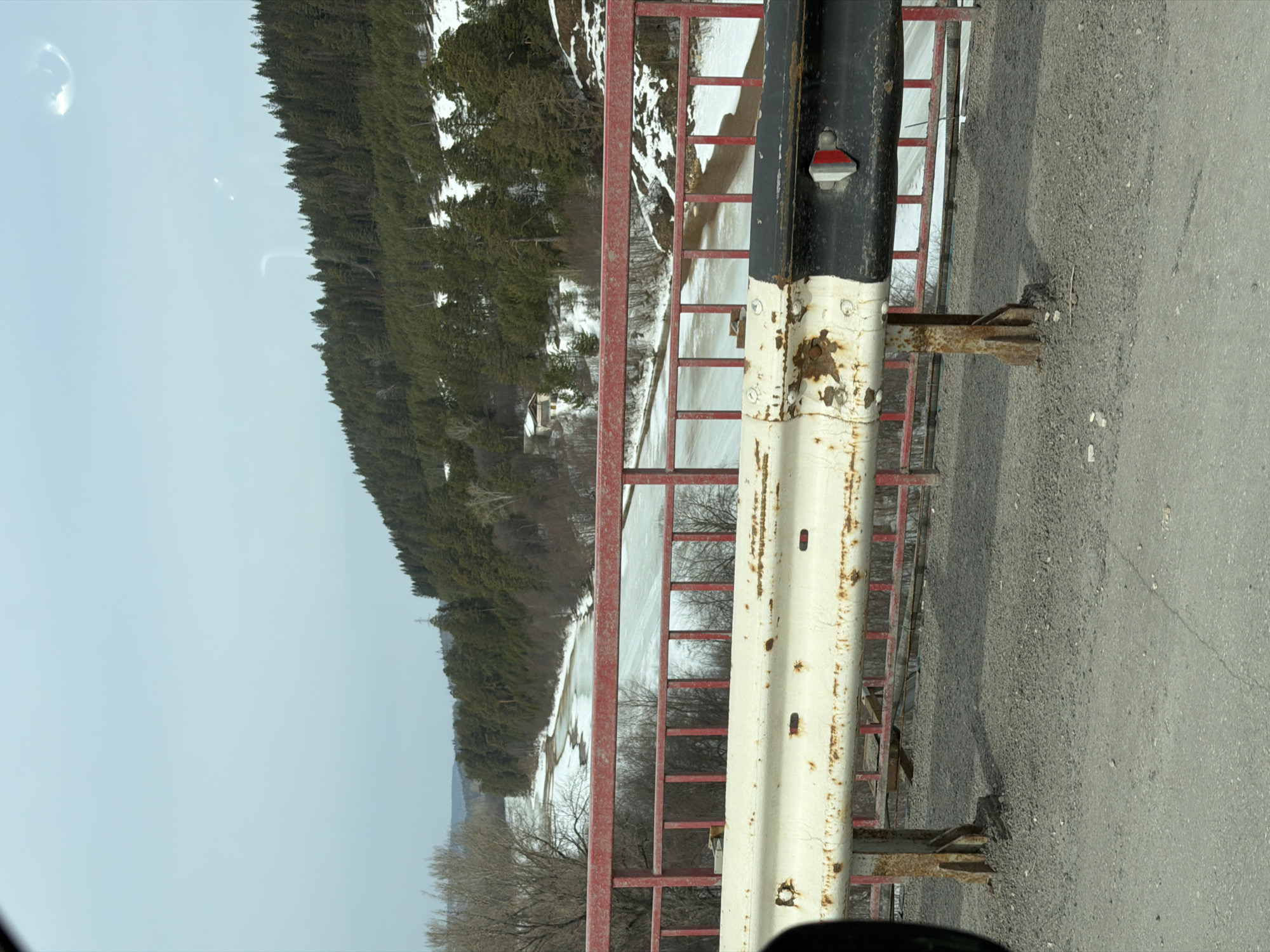 The image presents a panoramic view from a bridge overlooking a partially frozen river in Chusovoy, Russia, under an overcast, light grey-blue sky. In the immediate foreground, a heavily rusted white and black metal guardrail, featuring a red and white reflector on its black section, runs horizontally across the frame. This guardrail is supported by rusted metal posts secured into the grey asphalt road surface, which is scattered with small gravel and debris. Behind the guardrail, a red metal bridge railing with multiple vertical balusters is visible. Below the bridge, the river flows from the background toward the left, largely covered with broken ice floes and patches of murky brown open water, indicating a thaw. The riverbanks are uneven, with visible snow patches. The left bank is lined with bare deciduous trees, while the right bank features a steep, snow-dusted slope leading up to a densely forested hill. This hill is primarily covered with dark green evergreen trees, with scattered snow on its lower gradients. A small, light-colored building with a dark roof is nestled into the right hillside, partially obscured by trees and snow, situated above the riverbank. A power line pylon is faintly visible above the tree line in the distant background on the right. The sky is uniformly light grey-blue, with reflections, likely from a vehicle's interior, visible in the upper right quadrant. No individuals or specific actions are discernible within the scene.