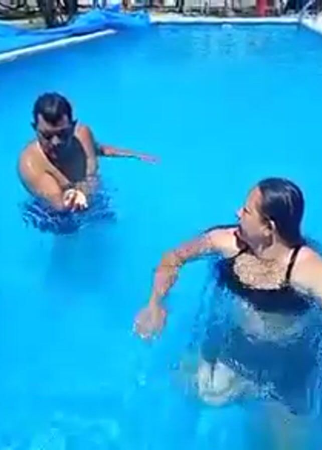 In a brightly lit outdoor swimming pool filled with clear blue water, a man and a woman are standing chest-deep. The man, positioned on the left, has short dark hair and is shirtless. He extends his right hand towards the camera. The woman on the right, with dark hair pulled back, is wearing a black swimsuit. She also extends her left arm towards the camera. The pool's edge, lined with white tiles, is visible in the background, with a blue pool cover partially covering one end. Trees are visible at the periphery of the scene.