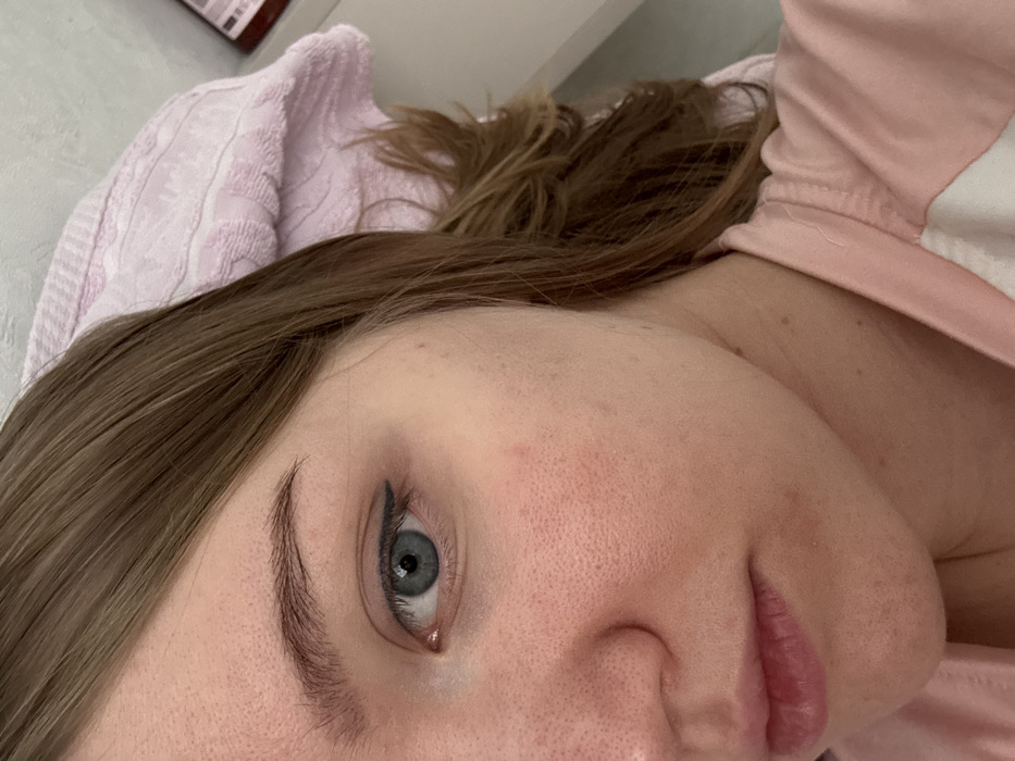 A close-up, angled self-portrait features a female subject's right facial profile and upper torso, taken in an indoor setting. The subject has light skin, medium brown hair, and a blue right eye. Black winged eyeliner is applied to the upper eyelid. The skin shows visible pores on the nose and cheek areas, along with minor localized redness. The subject's lips are partially visible. She is wearing a light pink garment with a white segment or trim on the shoulder area. Behind her head, a light pink or lavender terrycloth towel, folded or bunched, is partially visible against a light-colored wall or surface. To the upper right, a dark brown bottle with a partially visible label rests on a white horizontal surface. No specific visual cues within the image definitively confirm the location as Nizhnekamsk, Russia.