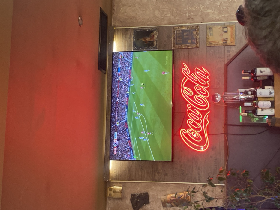 This image depicts the interior of a commercial establishment, likely a bar or restaurant, located in Dimitrovgrad, Bulgaria. A large, black-framed flat-screen television is centrally mounted on a wall featuring horizontal wooden paneling. The screen displays a football (soccer) match in progress, showing a green field with numerous players in light blue/white and red kits. A score graphic in the top left corner indicates "MUN 0-0 CRY," suggesting a match between Manchester United and Crystal Palace. Below the television, a red neon sign spells out "Coca-Cola" in its distinctive script. To the left of the television, on a textured, light-brown wall, a small, light-colored rectangular object is affixed, beneath which is a dark, irregularly shaped object. Further down, a partial view of a carved wooden totem or statue is visible, alongside green plant foliage extending from the bottom left. To the right of the television, on a similar textured wall, three framed pictures or artworks are vertically arranged. Their contents are indistinct. An air vent is visible in the ceiling above the top right corner of the TV. Below the neon sign, a dark purple or brown upholstered backrest of a booth or bench is visible. On a surface in front of it, numerous bottles, predominantly wine bottles of various colors (green, amber, clear), are arranged. A tall, slender decorative object with a spherical top stands among the bottles, along with a green glowing item. The ceiling is a solid reddish-orange hue, possibly due to ambient lighting. A circular recessed light fixture is present on the far right of the ceiling. The lower right foreground is partially obscured by the back of a person's head, showing dark, curly hair.
