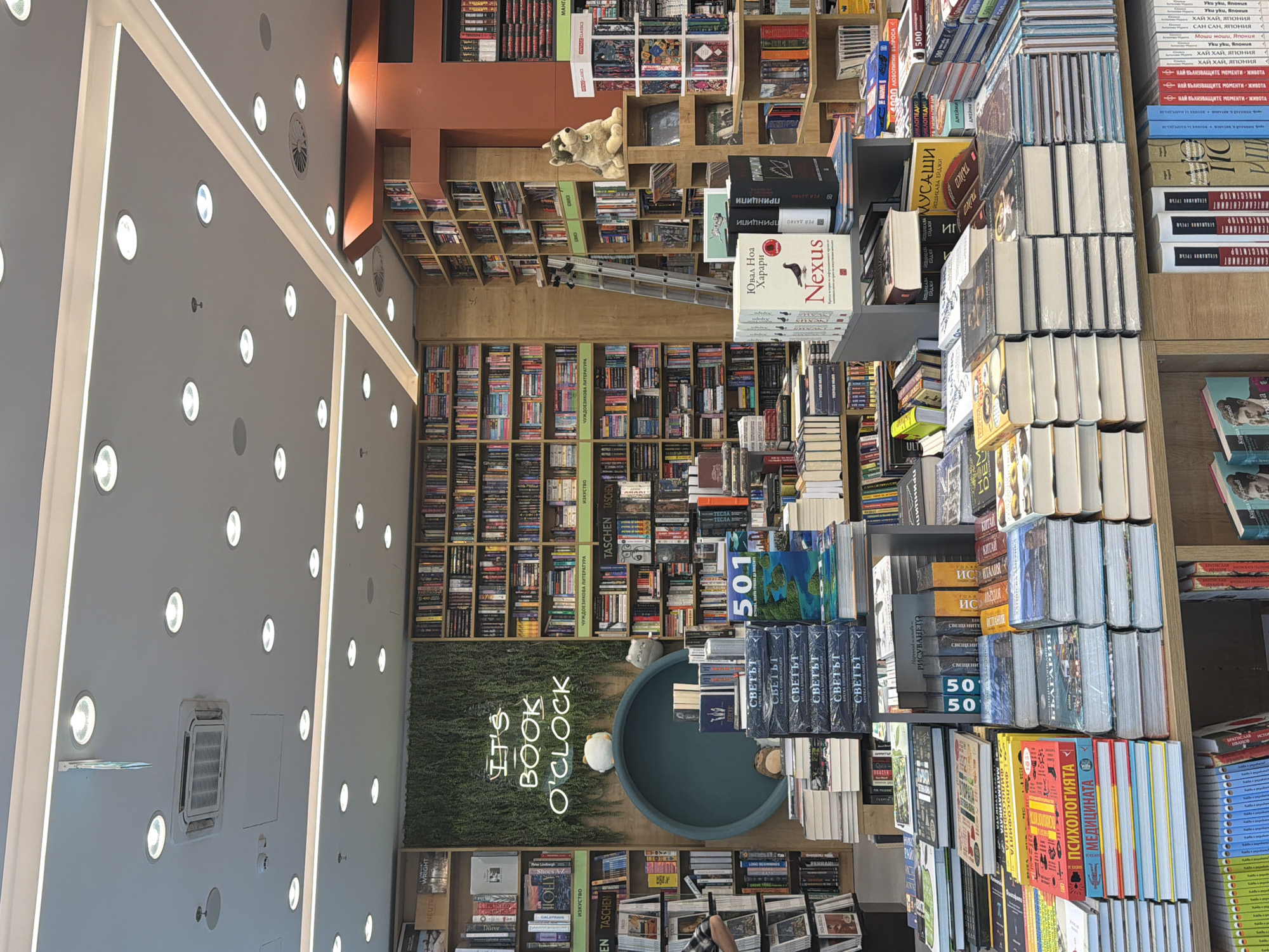 This is a shot of a bookstore's interior. Books are arranged on high shelves, organized by category, such as "Foreign Language Literature", "Art", and individual authors and titles. There is a seating area that is shaped like a pool with a circular bench. "It's Book O'Clock" is written in neon lights, surrounded by green foliage on the wall. There is a ladder positioned in front of the bookshelves. The ceiling is grey and contains many lights. From the presence of the book titles and the style of the bookstore, it is likely located in Sofia, Bulgaria.