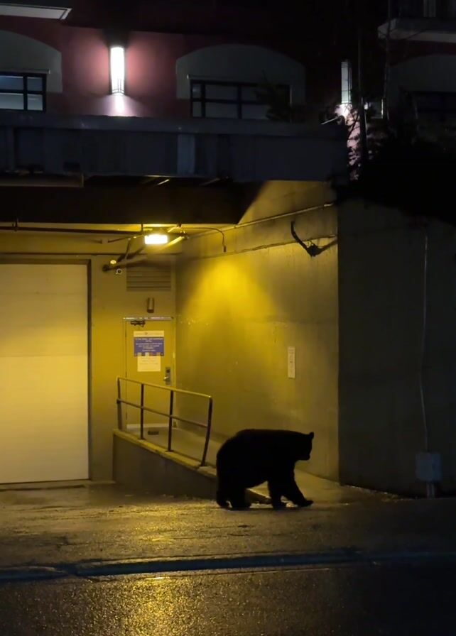 black bear walking on a wet street at night. The bear walks near a concrete building with a loading bay. An overhang protects the bear from the light above. The building across the street is multi-storied with windows and balconies.