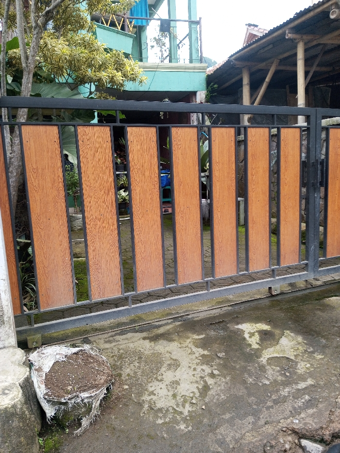 The image displays an exterior scene from Cibodas, Indonesia, centered on a residential gate and its immediate surroundings. A dark grey metal sliding gate with vertical reddish-brown wood-patterned panels stretches across the midground. Gaps between the panels offer glimpses of a garden area beyond, containing various potted plants and dense green foliage. The foreground consists of a concrete surface, discolored and marked with patches of moss or algae growth. On the far left, a tattered white woven sack, filled with soil, rests beside a grey concrete pillar. In the background, beyond the gate, a two-story house with a light turquoise facade and a balcony is visible on the left. Blue fabric is draped over the balcony railing. To the right, a second structure with a corrugated metal roof supported by bamboo beams is partially visible. A tree with variegated green and yellow leaves stands to the left, extending over the gate. No individuals are present in the depicted scene.