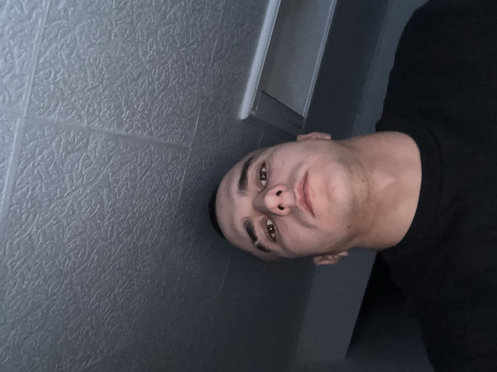 The image displays a low-angle, close-up portrait of an adult male in Shumen, Bulgaria. The subject has short, dark hair, brown eyes, and a distinct vertical scar or shaved line on his left eyebrow. He is wearing a black crew-neck t-shirt and is looking directly forward towards the camera. The upper portion of the frame is dominated by a light gray, textured ceiling with a stippled or uneven relief pattern. A rectangular light fixture or ventilation grate is partially visible on the ceiling in the upper right quadrant. The overall lighting is dim and uniform. No other subjects or significant objects are present, and no specific actions or interactions are depicted.