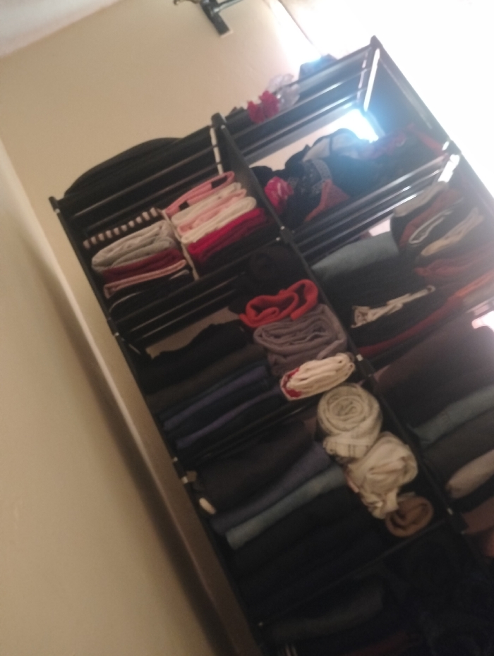 The scene is an interior space located in Nairobi, Kenya. The image, captured from a low, tilted angle looking upwards and to the right, displays a dark-colored, multi-tiered shelving unit or clothing rack against a plain, light beige wall. A bright light source, likely a window or overhead fixture, is visible in the upper-right portion, causing significant glare and overexposure. The shelving unit is segmented into multiple vertical columns and horizontal shelves, all densely filled with folded and stacked garments. On the left side, shelves contain neat stacks of clothing primarily in shades of grey, white, red, and pink, with lower shelves holding darker-colored folded items, including blues, blacks, and greys. On the right side, the upper shelves contain more loosely arranged clothing, some appearing as undergarments in bright reds and pinks. Below these, subsequent shelves feature a mix of folded dark apparel and several lighter-colored items that are rolled, including a white fabric with a red edge and another light-colored, possibly patterned, fabric roll. No individuals are present in the scene; the image solely depicts the static storage of clothing.