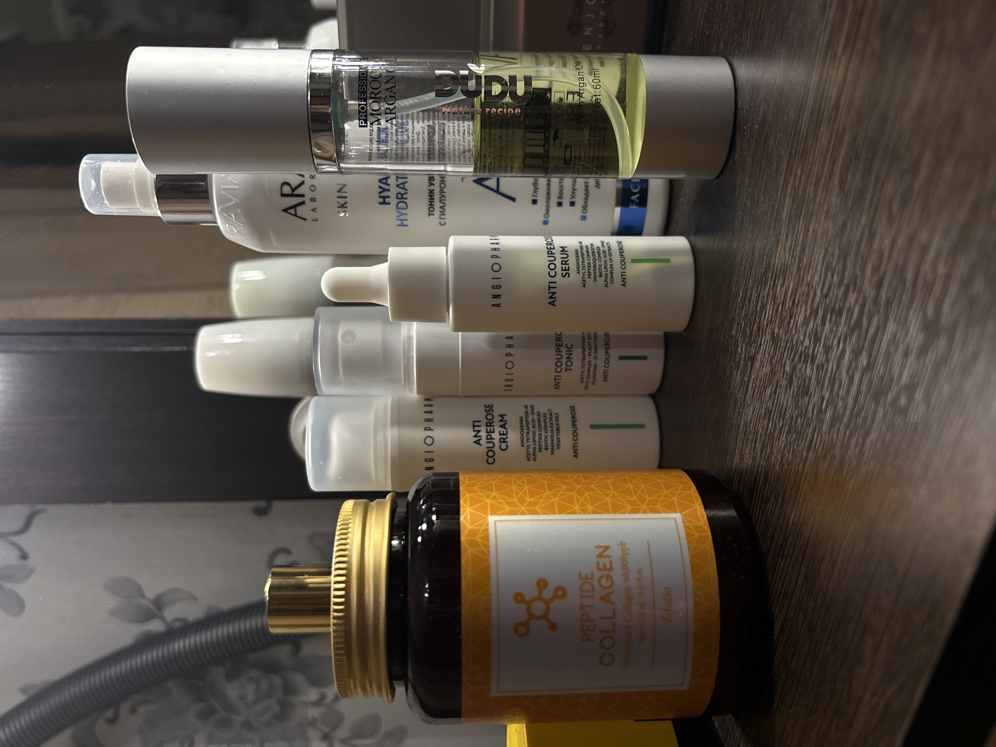 Here's a description of the image: The image shows a collection of skincare products stacked on a surface, likely a shelf. At the top is a bottle labeled "Dudu recine Professional Morocco Argan Oil". Below that is a bottle labeled "RAVIA AR Skin HYA Hydrat Тоник УВ с гиалурон". Further down are three bottles from "ANGIOPHARM", labeled "Anti Couperose Serum", "Anti Couperc Tonic", and "Anti Couperose Cream". At the bottom is a brown bottle with a gold lid labeled "Peptide Collagen". There is no information in the image indicating the location is Perm, Russia.