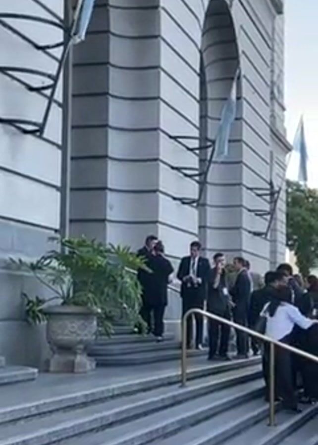 group of people standing on the steps of a building. Most of the people are dressed in suits or professional attire. There are also some security personnel present. The building has large arches and Argentine flags hanging from its facade. The overall atmosphere seems to suggest a formal event or gathering. One person is talking into a microphone.