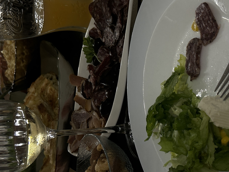 - "The image depicts an indoor dining scene at an unspecified location within the city of Unknown, Unknown, likely an evening meal, viewed from a close-up, slightly elevated perspective focusing on a table laden with food and drinks" by FM-jvZSc2, licensed under CC BY 4.0