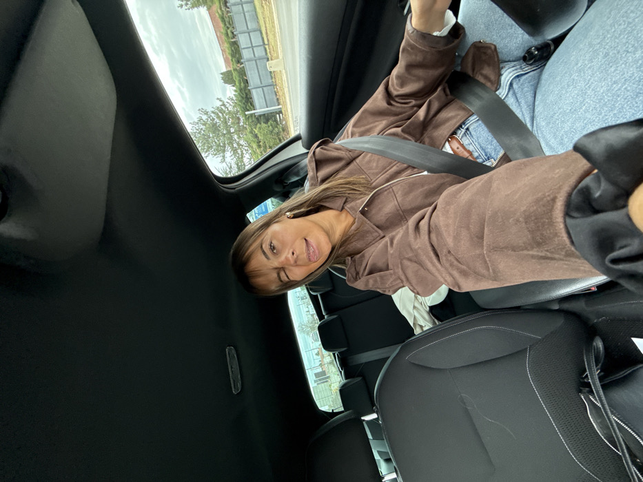 The scene depicts a female individual inside the driver's seat of a vehicle, taking a selfie