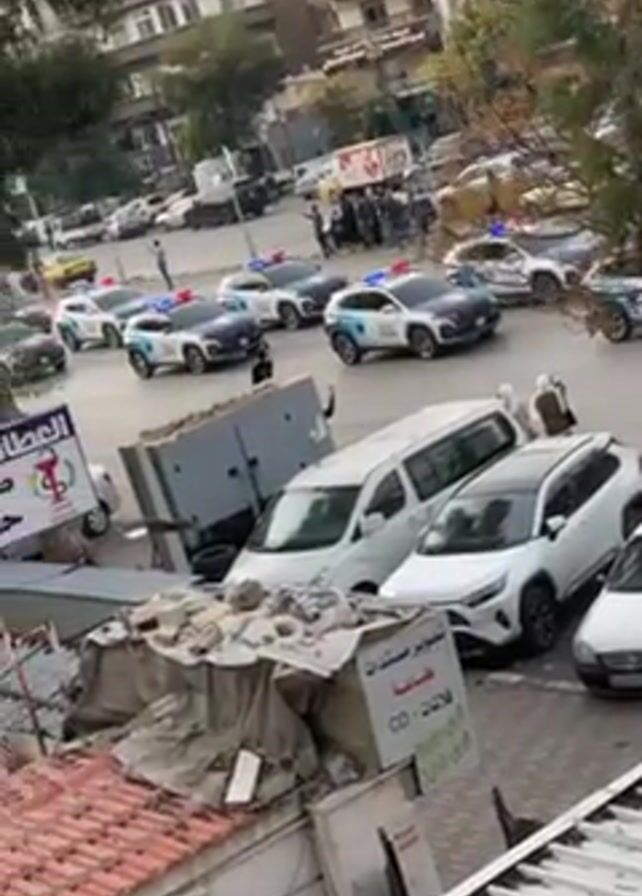 street scene from an elevated perspective, possibly a building rooftop. Several police cars with flashing lights are visible, parked on the street. People are gathered near the police vehicles. The surroundings include buildings, trees, parked cars, and street signs in Arabic. The overall atmosphere suggests an incident or event requiring police presence. A siren can be heard in the background.
