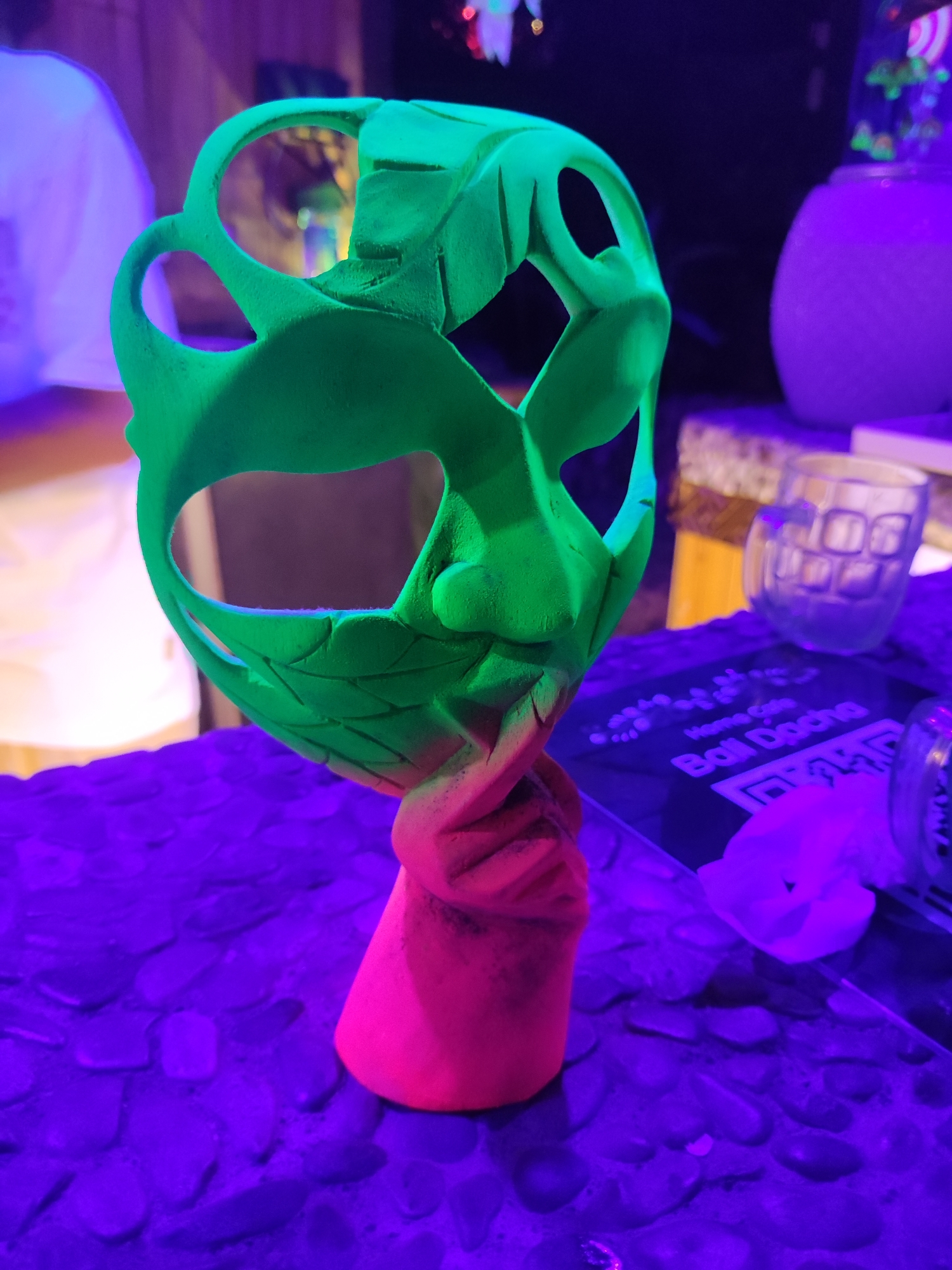 A bicolored, stylized, fluorescent art object stands prominently on a dark, pebbled surface under ultraviolet illumination in the city of Lokaserena, Indonesia. The object, approximately 30-40 cm in height, features an upper section shaped like an abstract face or mask with large eye cutouts, rendered in a textured, neon green material. Its lower section, serving as a pedestal, is a twisted, abstract form in a vibrant neon pink. The pebbled surface beneath the object reflects a deep purple hue from the UV light. In the background, from left to right, an indistinct white object or garment is partially visible. To the right of the art object, a dark rectangular sign or menu with glowing white text reading "Hanna Cafe Bali Dacha" and a QR code is visible. Further right, a clear, textured glass tumbler and a larger, opaque, light purple globular container are present, both reflecting the ambient UV light. Indistinct glowing green decorative elements are visible in the far background. The scene is characterized by the strong ultraviolet lighting, which causes the fluorescent elements to emit intense colors.