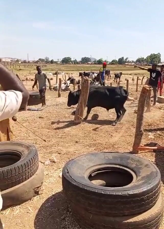 group of people standing in a dirt-covered area with multiple cattle tethered to wooden posts. The ground is scattered with tires. One black bull is walking around a post, its tether visible. A child runs toward the bull. Other cattle can be seen in the background, some tethered, others walking freely. The sky is clear and blue. Buildings are visible in the distance.