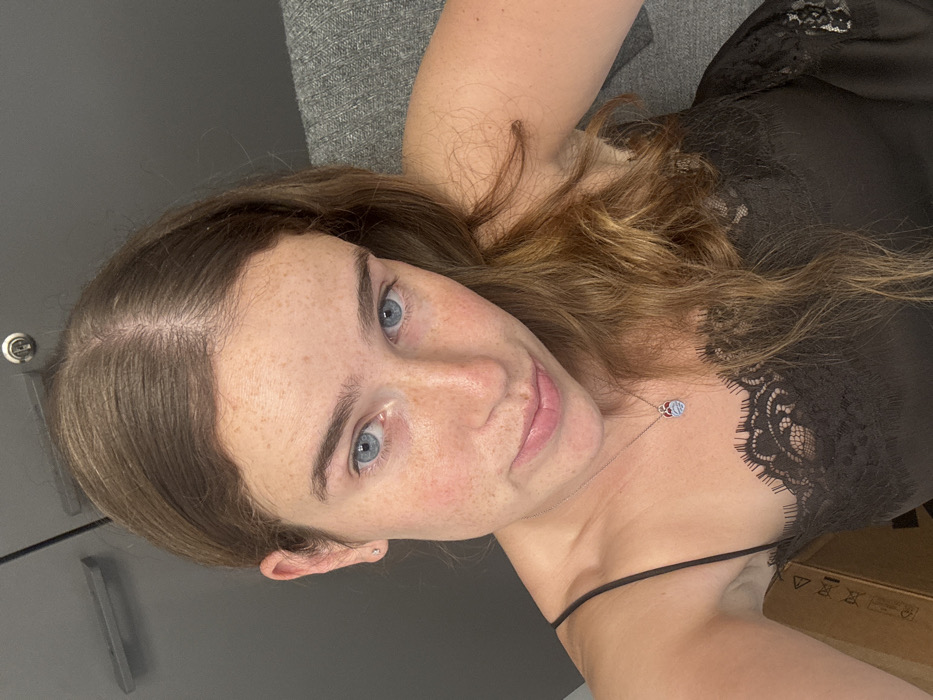 The image displays a close-up, high-angle selfie of a young adult female. She has light skin with visible freckles across her face and upper chest, blue eyes, and light brown hair parted in the middle, extending over her shoulders. She is wearing a black spaghetti-strap top with a prominent black lace trim along the neckline. A silver-colored chain necklace with a small, colorful pendant, resembling a Hamsa hand (featuring blue, white, and red elements), is visible on her chest. A small, silver-colored stud earring is present in her left earlobe. The subject maintains a neutral expression, looking directly at the camera. The background indicates an indoor setting: dark, possibly black or dark grey, cabinets with silver handles and a keyhole are visible in the upper left, while a textured grey fabric, consistent with upholstery, occupies the upper right. A segment of a light brown cardboard box with black markings is visible in the lower left. The image provides no discernible visual information to confirm the specified location within Bnei Brak, Israel.
