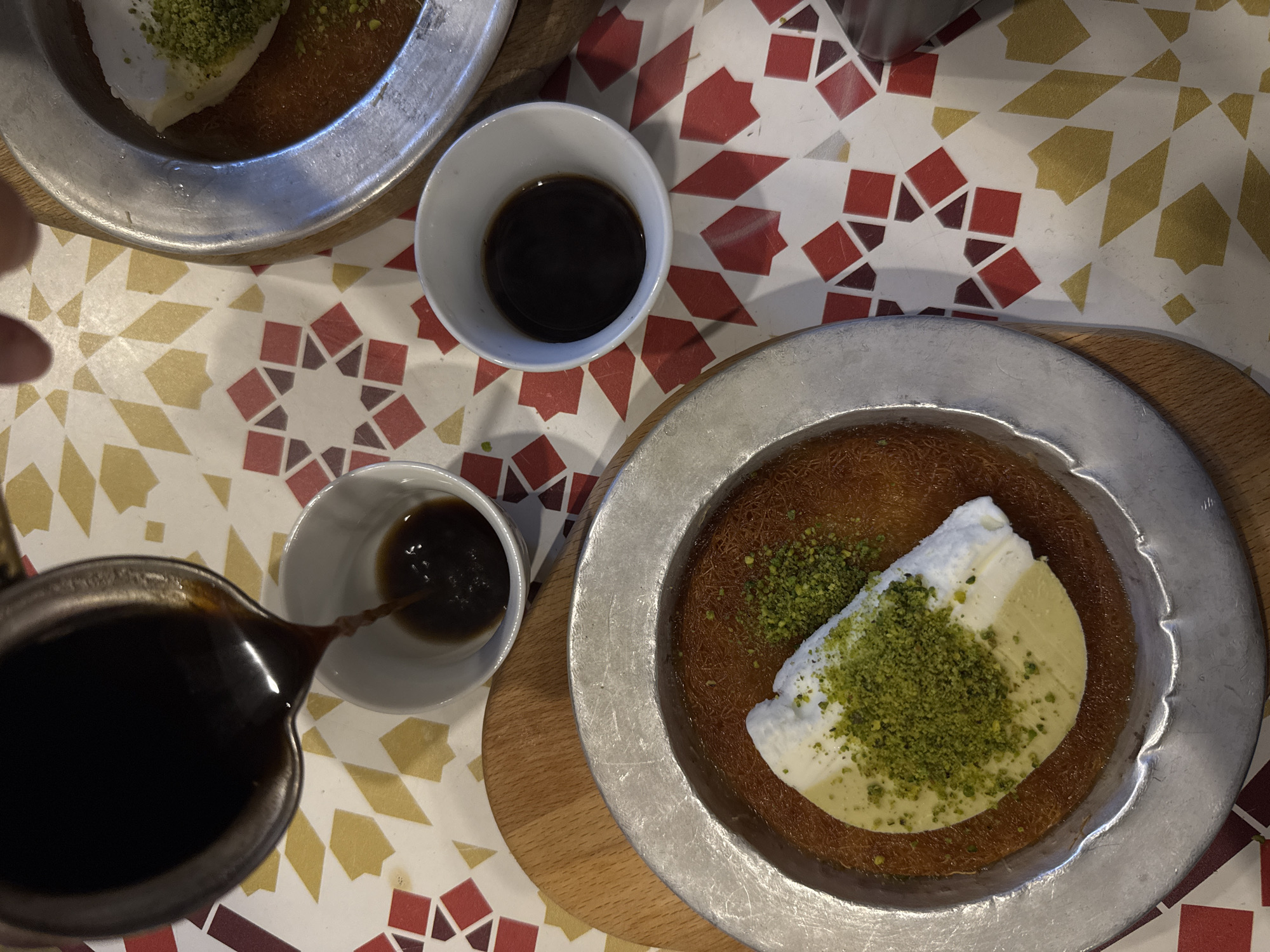 A high-angle shot captures a scene of Middle Eastern dessert and coffee consumption. Two metal plates hold desserts, likely knafeh, topped with what appears to be clotted cream and sprinkled with ground pistachios. Two small white cups hold dark coffee, and coffee is being poured into one of the cups from a dark-colored metal coffee pot. The setting is a table covered with a patterned, geometric tablecloth in red, gold, and white. The location appears to be a restaurant in Tel-Aviv, Israel, known for serving this type of dessert and coffee.