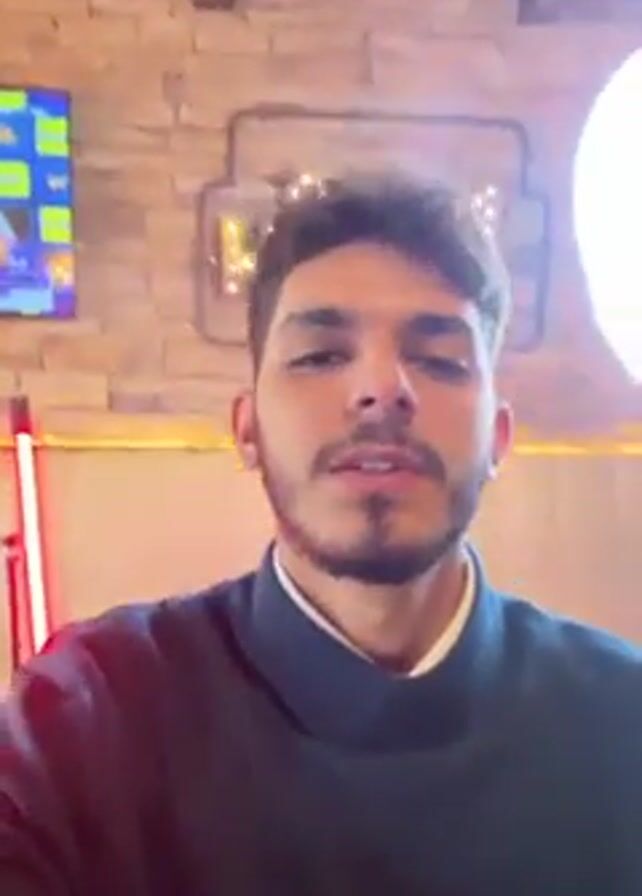 A young man with brown hair and a goatee stands in what appears to be a restaurant, holding a small, rectangular blue and yellow device. He is wearing a dark blue turtleneck sweater. Behind him is a brick wall with a neon sign that reads "Road House." There is also a TV screen showing a game. The lighting in the room is warm and slightly dim. The camera is held at eye level, suggesting the video is a selfie.
